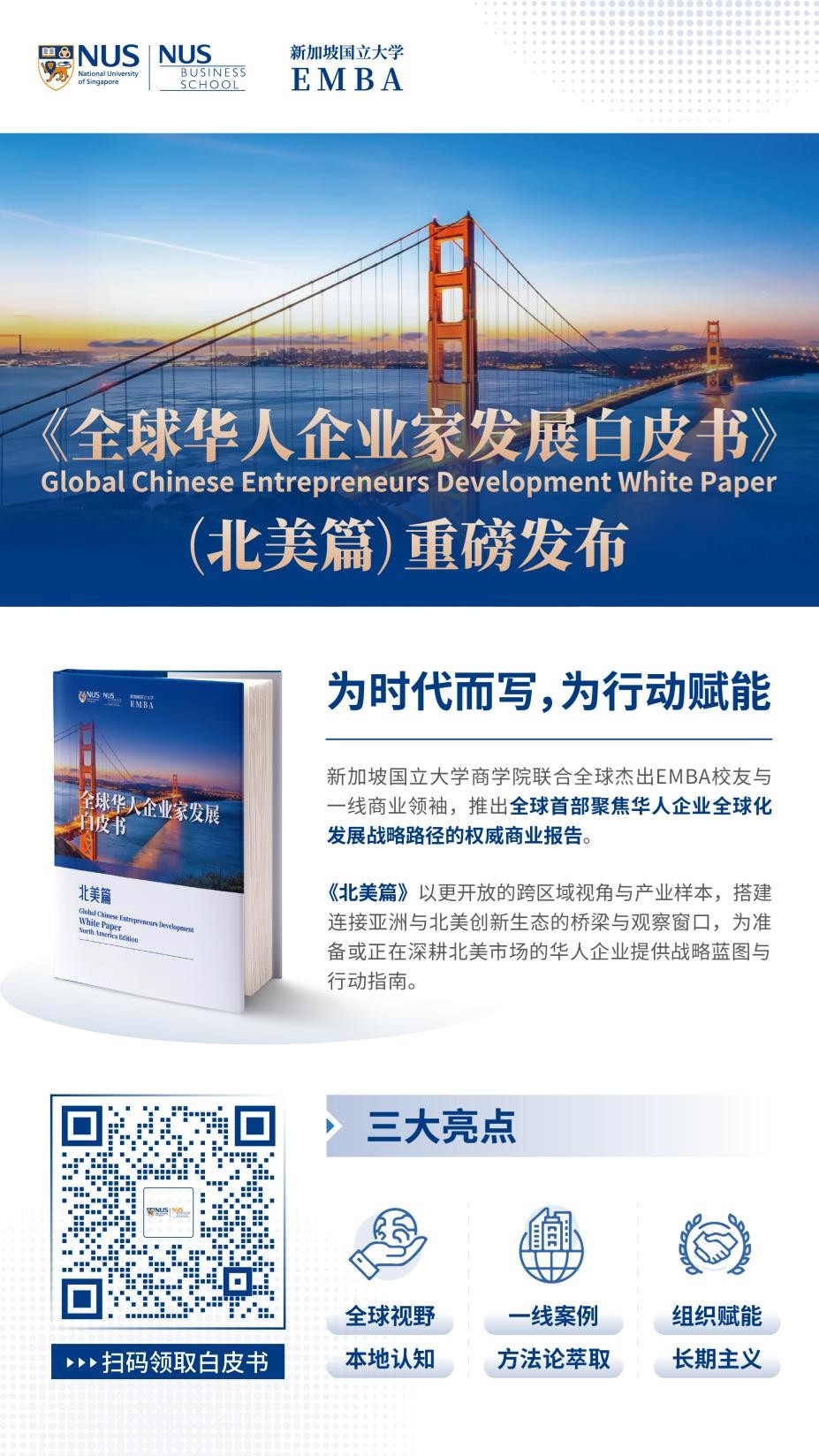 在新一轮全球化与技术跃迁的浪潮下,华人企业家正加速完成从“业务出海”到“组织全球化”的进阶升级。作为“通往世界的窗口”,新加坡国立大学EMBA致力于思想引领与全球资源链接,赋能华人企业家在复杂多变的全球格局中把握确定性机会。2025 年,新国大商学院携手具有全球影响力的 EMBA 校友与一线商业领袖,隆重推出《全球华人企业家发展白皮书》(Global Chinese Entrepreneurs Development White Paper)系列,对华人企业的全球化战略路径开展系统性研究。 作为全球首份系统聚焦华人企业全球化战略路径的权威商业报告,该系列不仅梳理关键市场的宏观与政策环境,也深度呈现40余位一线企业家的真实路径与组织实践,形成可借鉴、可落地、可持续的行动指南。